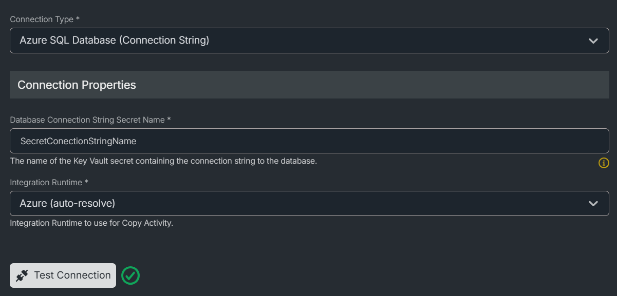 Once you know your connection type, you then fill out the specific properties for that connection, which are often names of secrets that you have stored in your Key Vault. Depending on the connection, a Data Factory Integration Runtime may also be required.