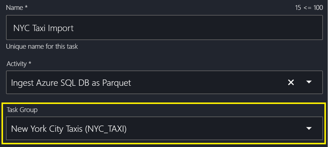 Each Task Group can contain an optional set of variables that are shared by its tasks. For instance, the database connection string or storage account folder in which the files should land. For this reason, it's best not to make groups too broad. We wouldn't recommend putting tasks belonging to two different source databases into the same group.