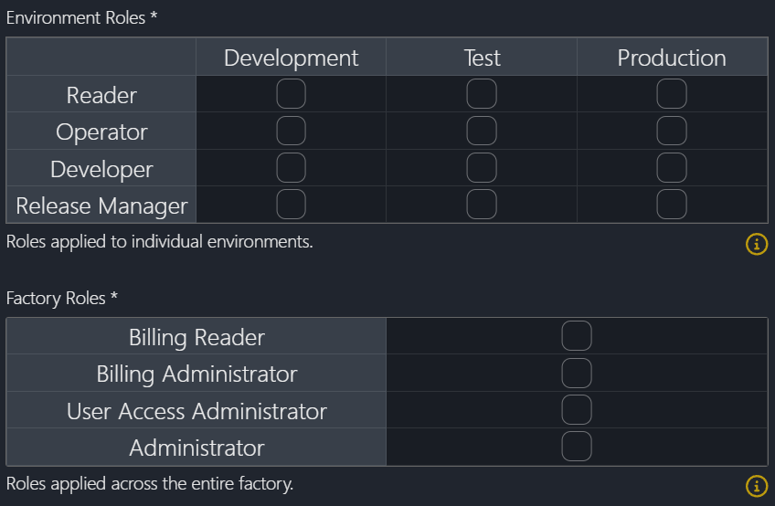 We have also split the roles into two groups, Factory Roles and Environment Roles. As the names imply, Factory Roles are assigned to users at the Insight Factory level, meaning they apply across all environments of the Insight Factory and Environment Roles apply to that specific environment only (for instance, most users are granted the Developer role with the Development Insight Factory, but very few, if any, should be granted this role in Production).